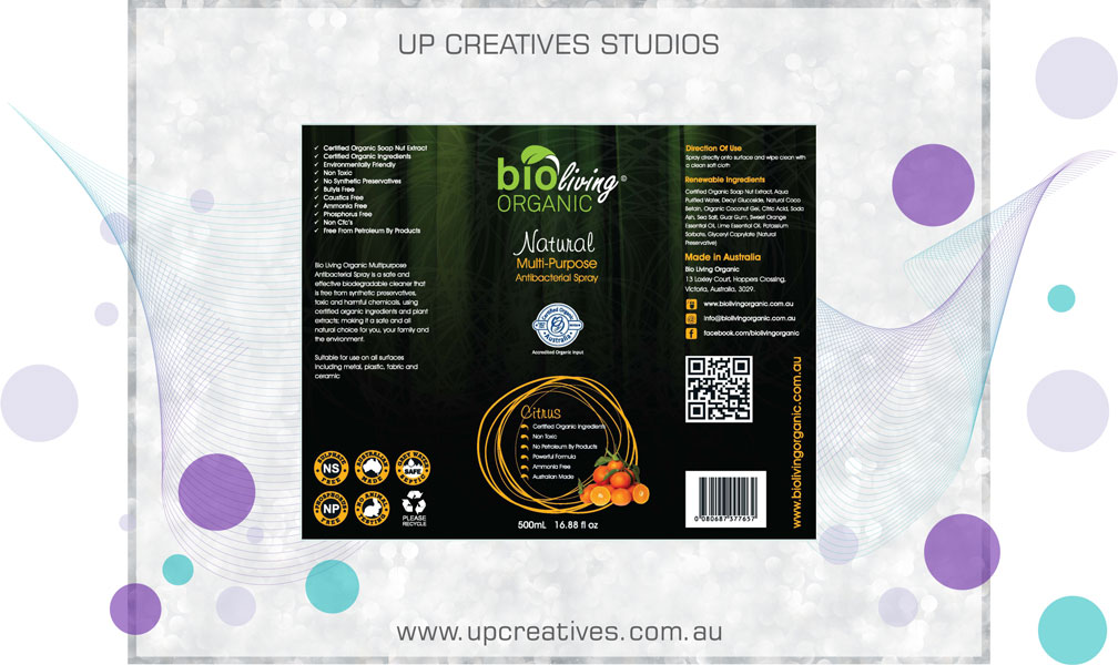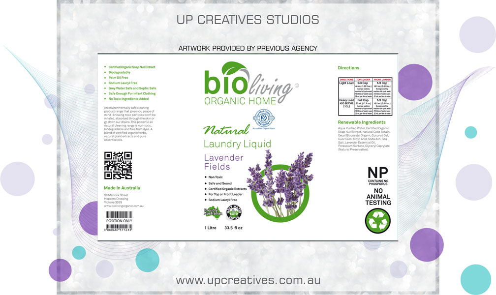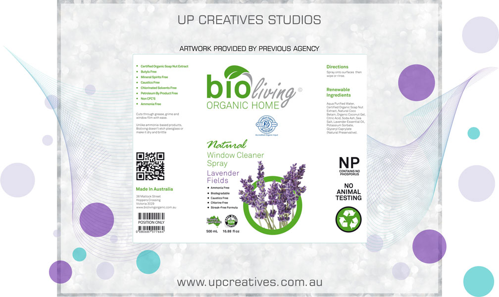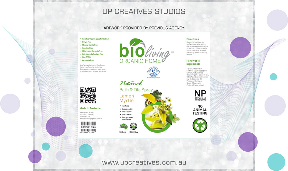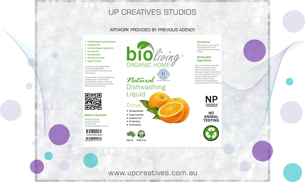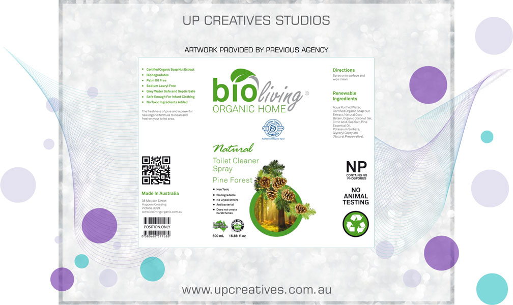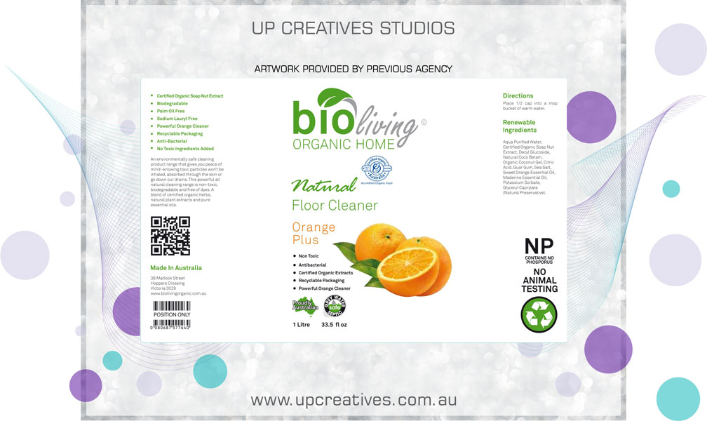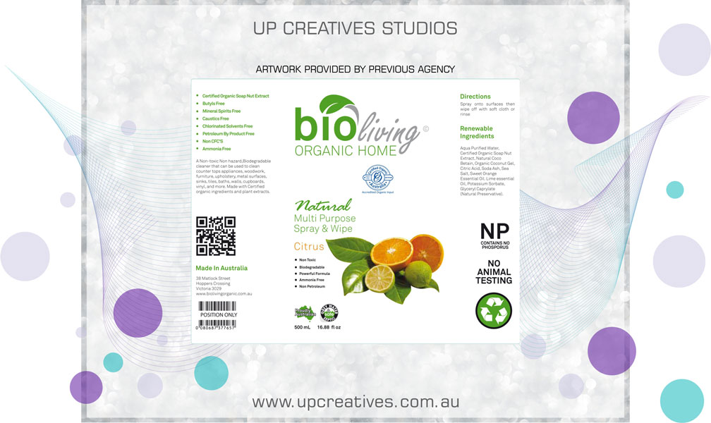 Bio Living Organic is a Melbourne based organic cleaning product manufacturer. A family owned business that approached Up Creatives Studios initially for a quote for the production of labels for an existing design that was organised by another marketing agency. Upon final checking of the supplied artwork for prepress and production, it was discovered that the artwork was not print ready and this was conveyed to the clients. The clients were appreciative that this error was picked up by Up Creatives Studios, however they were disappointed in the service they had received by the external agency that had managed their brand prior.