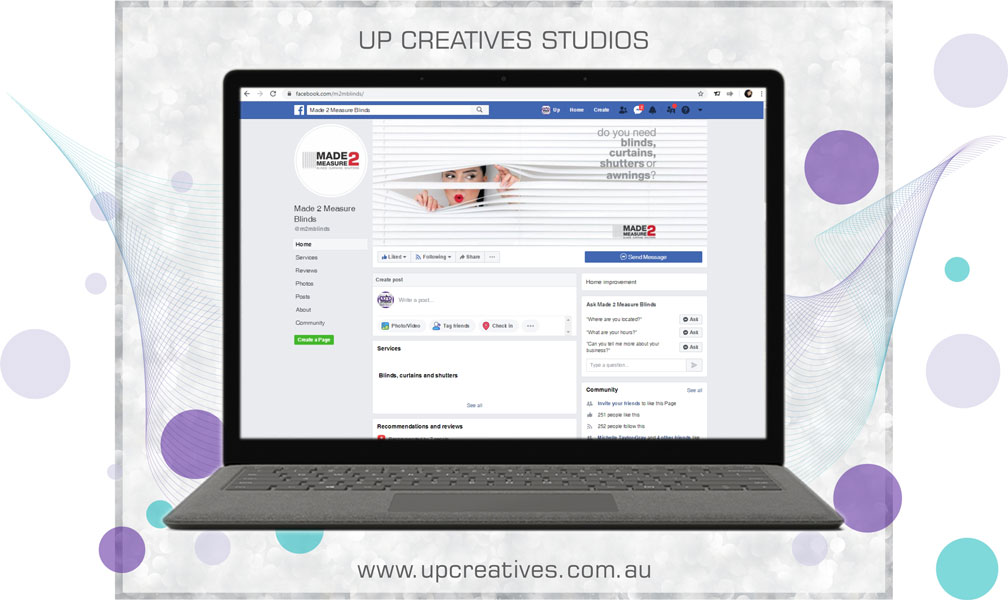 Made 2 Measure Blinds, a New South Wales based family business specialising in custom made window furnishings. Up Creatives Studios delivered their entire branding set-up over two days consisting of branding identity, business card designs, Double sided DL Flyer and Facebook cover banner.