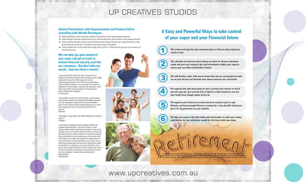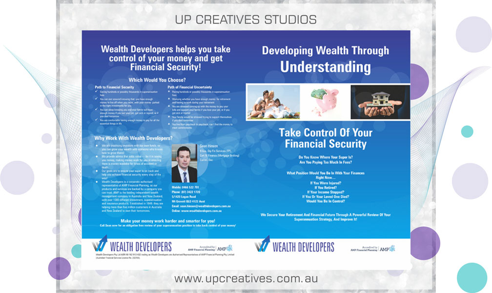 Wealth Developers, is a Queensland based financial planning company who were after a 4 printed panel A4 brochure design. The entire project was solely through correspondence and the clients were extremely pleased with the final product.